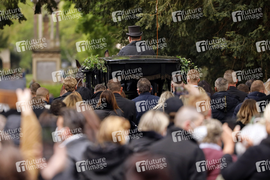 Kutsche mit Sarg und Trauergästen bei der Trauerfeier und Beerdigung von Willi Herren auf dem Melaten Friedhof. Köln, 05.05.2021