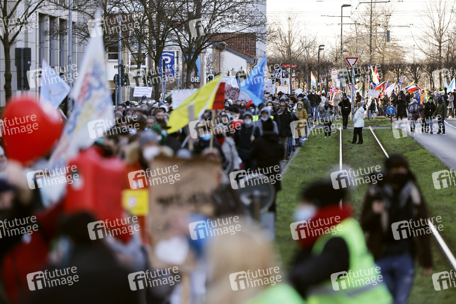 Bei einer angemeldeten Demo unter dem Motto 'Wir alle gemeinsam - Freie Impfentscheidung' demonstrierten etwa 12.000 Gegner einer Impfpflicht mit einem Spaziergang gegen die Corona-Maßnahmen der Bundesregierung und für eine individuelle Impfentscheidung, Grundrechte und 'unversehrte' Kinder - darunter auch viele Pflegekräfte, die wegen der Impfpflicht im Gesundheitsbereich ihren Job zu verlieren drohen. Düsseldorf, 12.02.2022