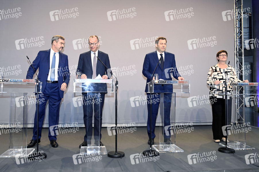 Markus Söder, Friedrich Merz, Lars Klingbeil und Saskia Esken bei der Pressekonferenz von CDU, CSU und SPD zur Vorstellung des gemeinsamen Koalitionsvertrages im Paul-Löbe-Haus. Berlin, 09.04.2025
