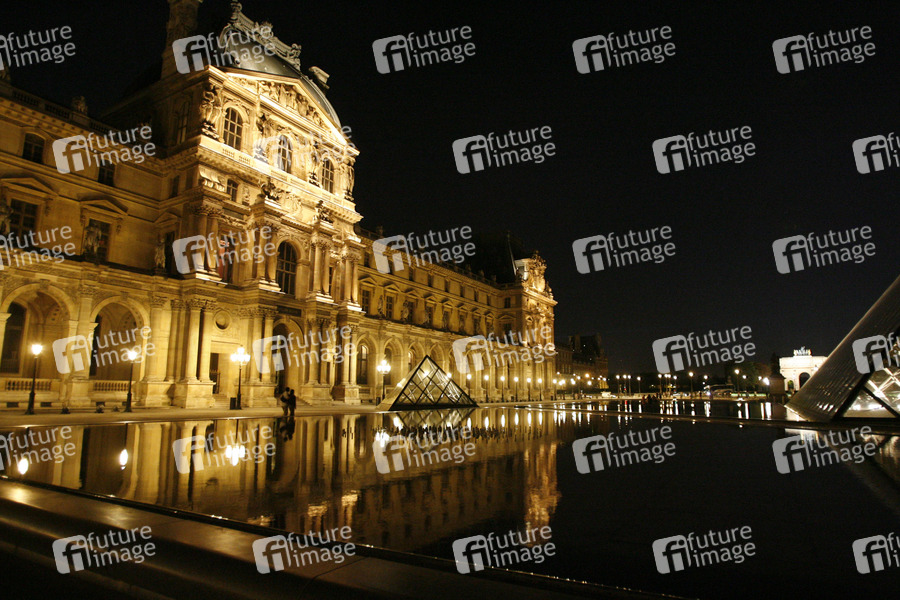 Sightseeing Paris. Im Innenhof des Louvre bei Nacht