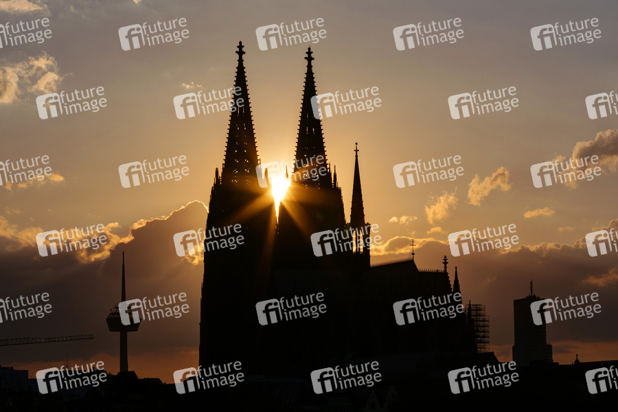 Lichtstrahlen, Sonnenstrahlen, Sonnenstunden, Rheinufer, Deutzer Ufer, Rhein, Sehenswürdigkeit, Sightseeing, Kölner Innenstadt, KölnTourismus, Tourismus Köln, Kölner Tourismus, Altstadt, Kölner Rheinufer, Rheinseite, Domstadt, Kölner Zentrum, Kölner Dom, Domtürme, Domspitzen, Kirche, Erzbistum Köln, Kirchensteuer, Kathedrale, Abendstimmung in Köln, UNESCO-Weltkulturerbe, Abendstimmung, Blaue Stunde, Abend, Sonnenuntergang, Symbolbild, Symbolfoto