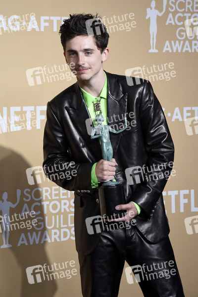 Timothee Chalamet mit dem Preis für den besten Kin-Hauptdarsteller in 'Like a Complete Unknown' beim Preisträger-Photocall der 31. Screen Actors Guild Awards 2025 im Shrine Auditorium and Expo Hall. Los Angeles, 23.02.2025