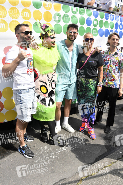 Rafi Rachek, Bambi Mercury, Alexander Schäfer, Natascha Ochsenknecht und Gast vor dem M&M's Truck bei der 44. Christopher Street Day Parade 2022 unter dem Motto 'United in Love! Gegen Hass, Krieg und Diskriminierung' vom Spittelmarkt auf gut sieben Kilometern über Potsdamer Platz und Potsdamer Straße zum Nollendorfplatz, von dort weiter zur Siegessäule und zum Brandenburger Tor. Berlin, 23.07.2022