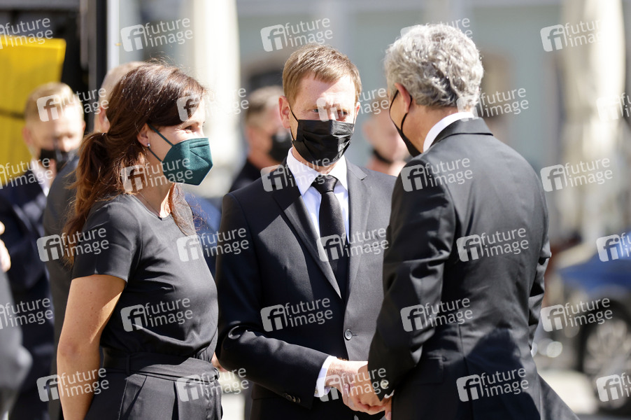 Michael Kretschmer mit Partnerin Annett Hofmann beim Trauerstaatsakt zu Ehren des verstorbenen früheren Ministerpräsidenten Kurt Biedenkopf in der Frauenkirche Dresden. Dresden, 03.09.2021