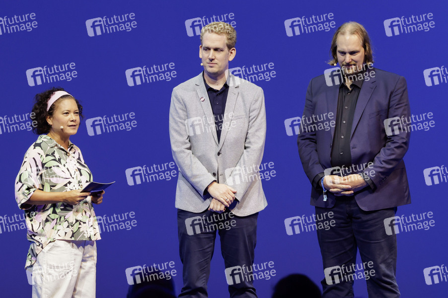 Viola Tensil, Marius Schelle und Stephan Jacob bei der Politischen Eröffnung der weltgrößten Computerspielmesse Gamescom 2025 in der KoelnMesse. Köln, 20.08.2025