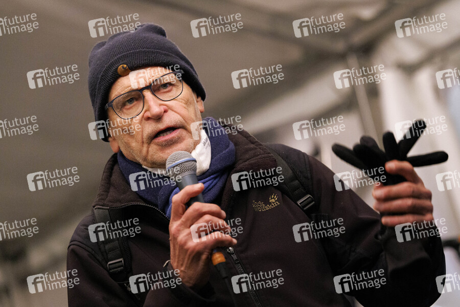 Günter Wallraff bei der Solidaritätsaktion mit Obdachlosen am Kölner Hauptbahnhof. Die Vereine 'Helping Hands' und die Sozialistische Selbsthilfe Mülheim (SSM) haben unterstützt von der Initiative 'Arsch Huh' am Wochenende dazu eingeladen, in einer Solidaritätsaktion drei Nächte am Hauptbahnhof zu übernachten. Köln, 03.12.2021