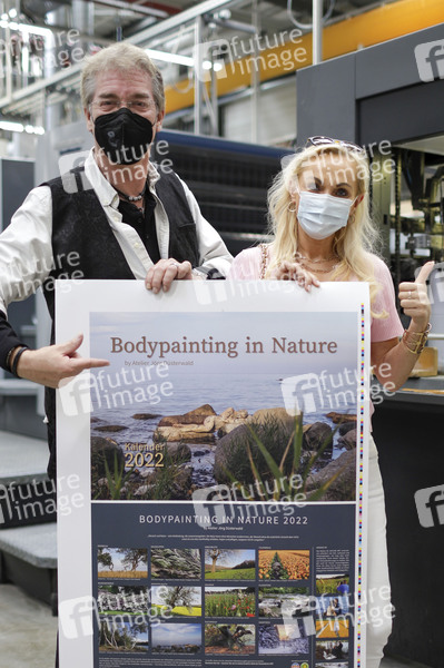 Jörg Düsterwald und Ewa Haas Stark bei der Präsentation des Düsterwald-Kalenders 'Bodypainting in Nature 2022' in der Druckerei QUBUS media. Hannover, 30.07.2021