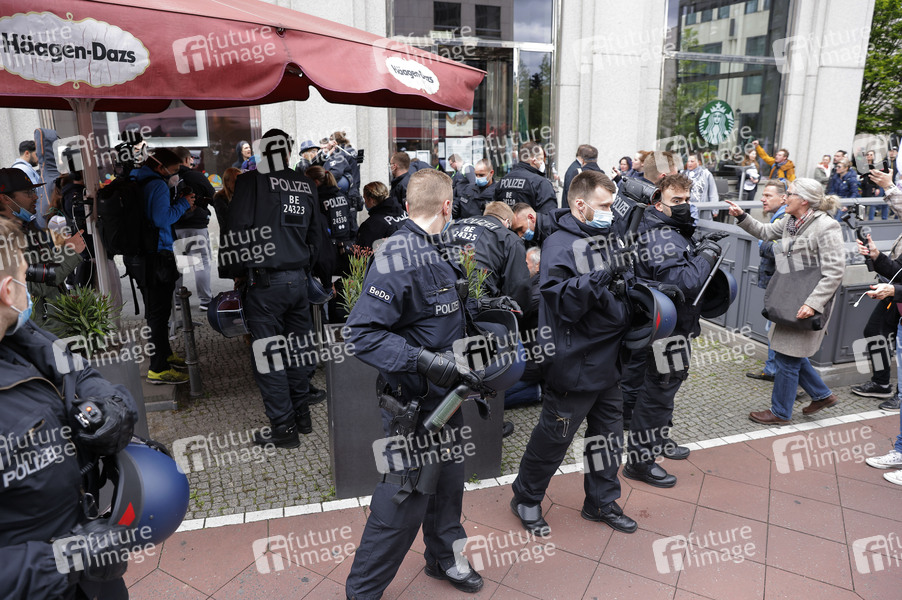 Am Brandenburger Tor haben sich am Mittag mehrere Hundert Kritiker der Corona-Politik der Bundesregierung versammelt. Nach dem Verbot von zwei großen Demonstrationen von Gegnern der Corona-Politik in Berlin hat die Polizei mit Gittern das Brandenburger Tor abgesperrt und Platzverweise erteilt.Die Polizei nimmt mehrere Demo-Teilnehmer fest und es stehen Wasserwerfer bereit. Kleinere Ansammlungen nahe des Potsdamer Platzes und in der Voßstraße wurden aufgelöst. Ein Demonstrationszug verlagert sich zur Leipziger Straße. Berlin, 22.05.2021