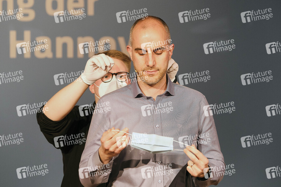 Belit Onay mit Tontechniker beim Wirtschaftsempfang 2021 der Landeshauptstadt Hannover, der coronabedingt digital stattfindet, mit dem Thema 'Umweltfreundliche Mobilität und Wirtschaft - ein Widerspruch?' in der Eilenriedhalle. Hannover, 19.04.2021