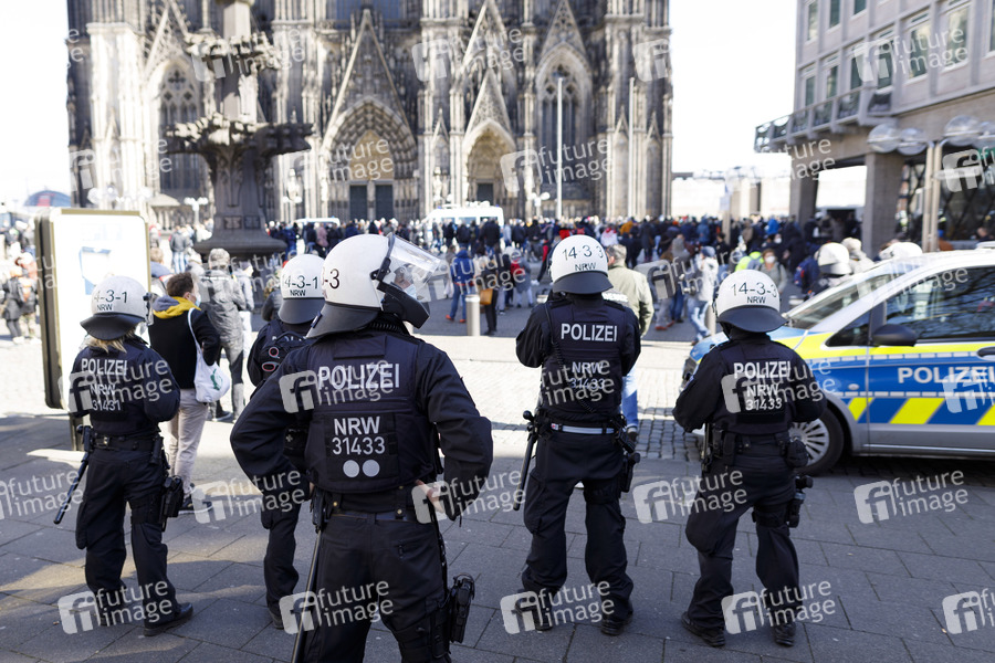 Eine unangemeldete Demo von Kritikern der Corona-Maßnahmen vor dem Kölner Dom wurde durch die Polizei aufgelöst. Die Demonstranten hatten sich ohne Masken und Mindestabstand versammelt und Parolen wie 'Widerstand! Widerstand!' skandiert. Die Teilnehmer protestieren gegen die aus ihrer Sicht überzogenen Corona-Maßnahmen und fürchten die Etablierung einer Corona-Diktatur. Köln, 27.03.2021
