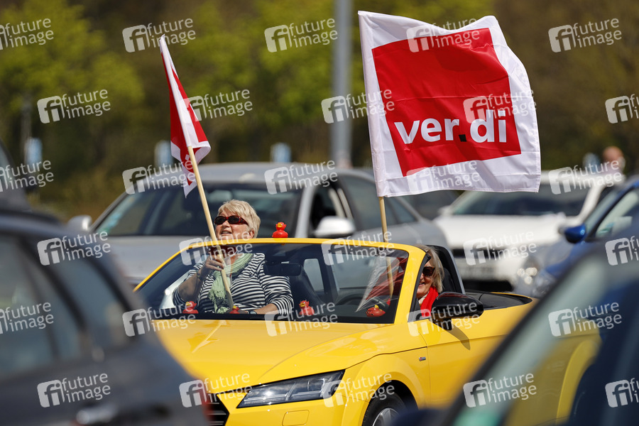Fahnen von Ver.di bei der Kundgebung des NRW DGB zum Ersten Mai im Autokino an der Merkur Arena. Düsseldorf, 01.05.2021