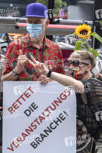 Loveparade-Gründer Dr. Motte und Vertreter der Veranstaltungbranche demonstrieren unter dem Motto 'Rettet die Veranstaltungsbranche' für eine Lockerung der Coronamaßnahmen, für finanzielle Unterstützung und die Unterstützung bei der Durchführung alternativer Veranstaltungskonzepte. Seit März sind die Musikklubs und Konzerthallen weitgehend geschlossen. Berlin, 24.07.2020