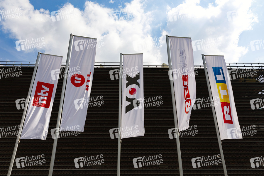 Fahnen mit Sender-Logos der Mediengruppe RTL Deutschland am Picassoplatz. Köln, 26.04.2019