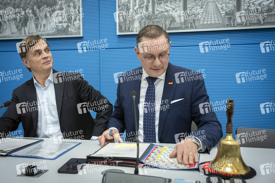 Bernd Baumann und Tino Chrupalla beim Pressestatement zur Fraktionssitzung der AfD-Bundestagsfraktion im Reichstagsgebäude. Berlin, 10.02.2025