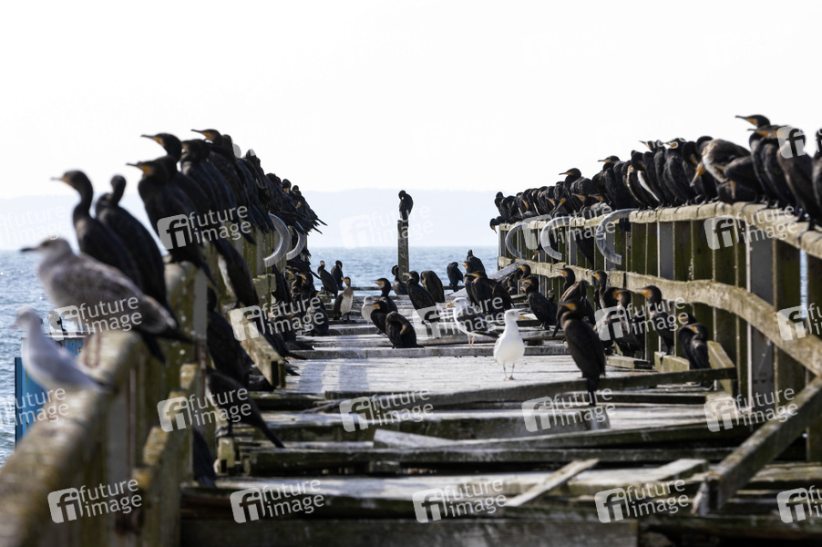Kormorane auf der Seebrücke Sassnitz auf Rügen an der Ostsee. Wegen baulicher Schäden ist die Seebrück seit 2016 für Besucher gesperrt. Sassnitz, 07.10.2024