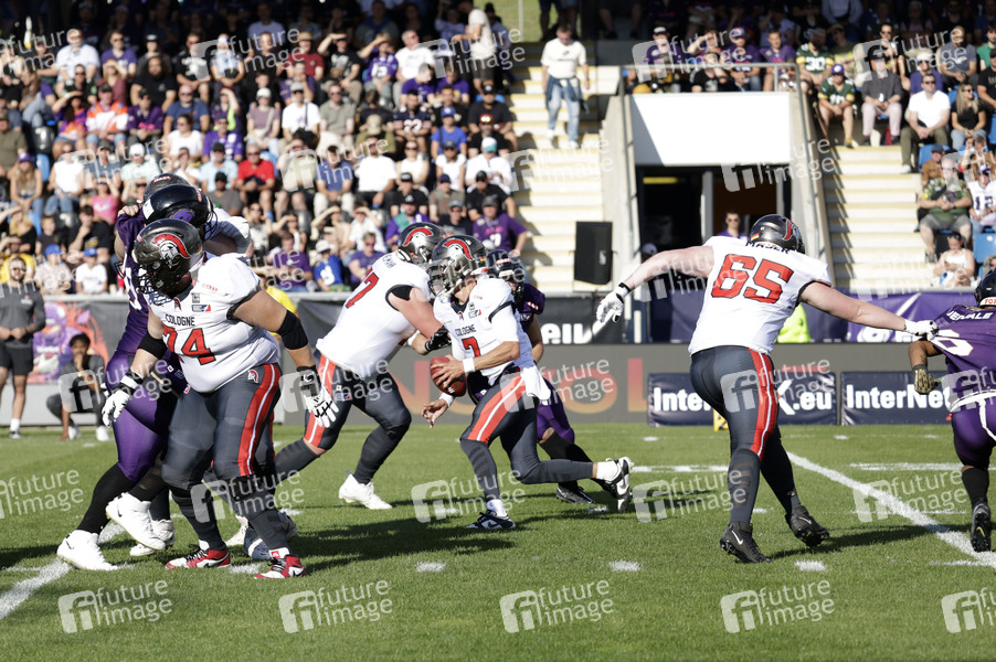 Jan-Hendrik Koch (74), Isaiah Weed (7) und Lukas Majer (65) beim American Football-Spiel Frankfurt Galaxy gegen Cologne Centurions in der PSD Bank Arena Frankfurt. Frankfurt am Main, 13.07.2024