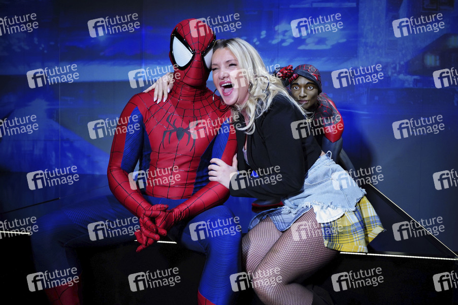 Evelyn Burdecki mit Spider-Man Cosplayer bei der Ausstellungseröffnung 'Marvel: Die Ausstellung - Universe of Super Heroes' im Odysseum. Köln, 06.03.2025