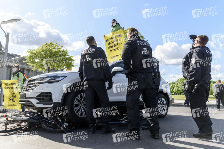 Mit vier Kundgebungen zwischen Kanzleramt und Bundestag protestieren Aktivisten von Campact, Fridays for Future, Ende Gelände, die Interventionistische Linke, Naturfreunde und die Umweltschutzorganisation Greenpeace vor dem Autogipfel im Berliner Kanzleramt gegen eine von den Autokonzernen geforderte Autoprämie. Diese neue Abwrackprämie soll im Rahmen einer Telefonkonferenz zwischen Bundeskanzlerin Merkel mit Vertretern der Automobilindustrie beschlossen werden. Berlin, 05.05.2020