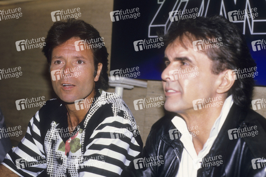 Cliff Richard und Dave Clark bei einer Pressekonferenz zur Präsentation von Dave Clark's Konzeptalbum 'Time' im Savoy Hotel. London, 26.07.1985