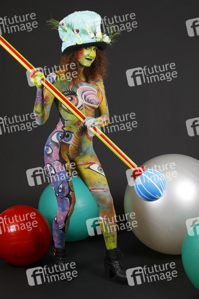 Das World Bodypaiting Festival 2020 fand aufgrund der Corona-Pandemie online statt. Unter dem vorgegebenen Motto 'Psychedelic Circus' verwandelte BodyArt-Künstler Jörg Düsterwald sein Model Lena in einen psychedelischen Mad Hatter. Hameln, 10.07.2020