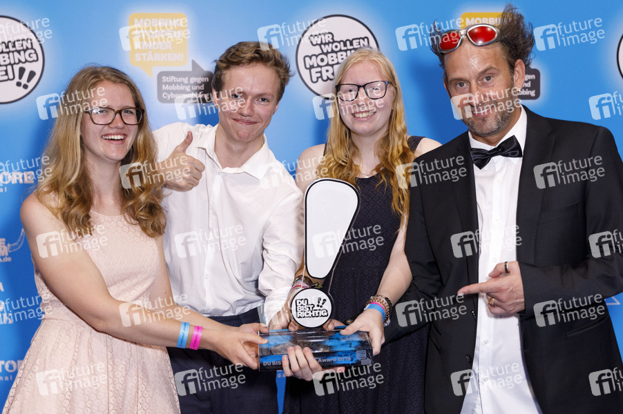 Tom Lehel mit den Preisträgern des 1. Du bist wichtig Award, die Gründer der Plattform JUUUPORT e.V. bei Family-Charity-Event 'Wir wollen mobbingfrei!! - Gemeinsam laut für starke Kinder' im E-Werk. Köln, 31.08.2019