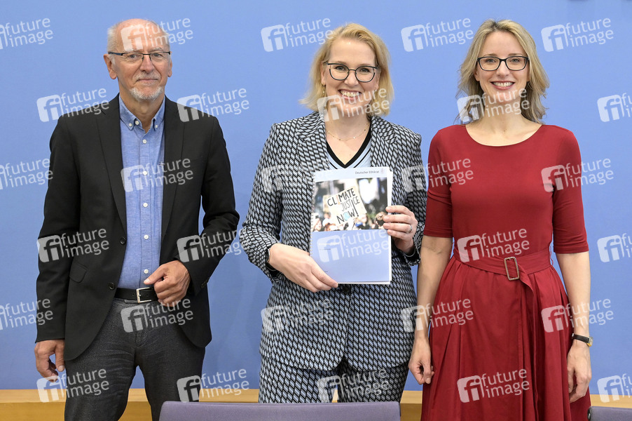 Armin Grunwald, Kerstin Schlögl-Flierl und Alena Buyx bei der Bundespressekonferenz zur Stellungnahme 'Klimagerechtigkeit' des Deutschen Ethikrats im Haus der Bundespressekonferenz. Berlin, 13.03.2024
