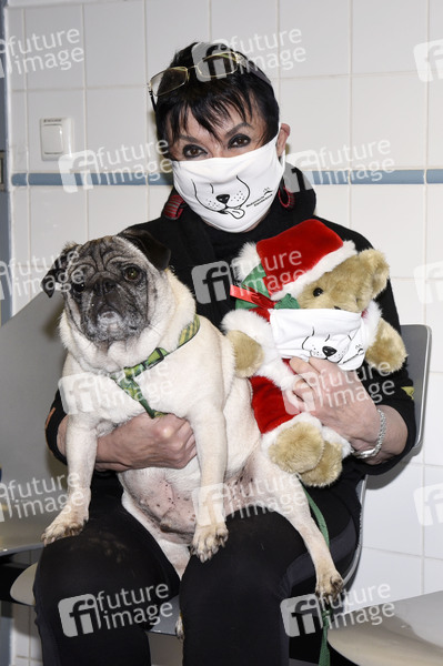 Uschi Ackermann mit Hund Willy beim Fototermin zur Masken- und Gondelspende in der Medizinischen Kleintierklinik der Ludwig-Maximilians-Universität (LMU). Uschi Ackermann hat ihren Mops Willi in der Medizinischen Kleintierklinik in Behandlung. Uschi Ackermann trägt eine Maske, mit cooler Hunde-Illu und dem Klinik-Logo. Sie hat der Klinik 100 tierisch bedruckte Stoffmasken gespendet. München, 21.12.2020
