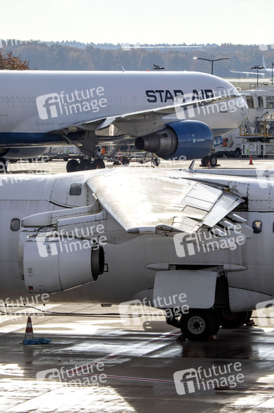 Übungsvorbereitung am Flugzeug bei der Notfallübung der Werkfeuerwehr, der Feuerwehr Köln und den Hilfsorganisationen am Flughafen Köln/Bonn. Im Rahmen der Übung wird die Kollision eines Flugzeugs mit einem Passagierbus und einer Abfertigungshalle simuliert. Einsatzkräfte retten aus dem in Brand geratenen Flugzeug und dem Gebäude Personen und versorgten diese. Köln, 06.11.2021