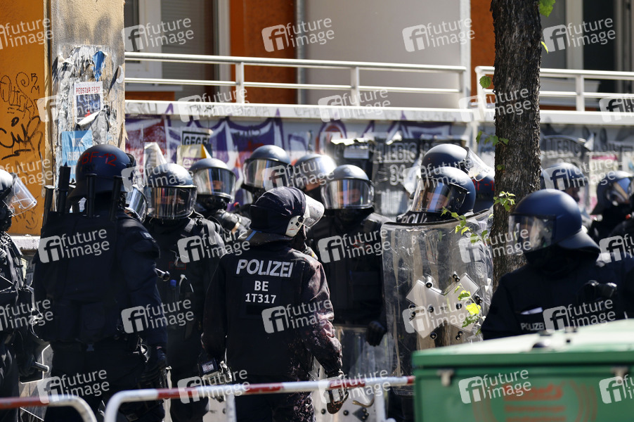 Im teilbesetzten Haus in der Rigaer Straße 94 sollte am Donnerstag der Brandschutz überprüft werden. Nachdem die Bewohner sich zunächst weigerten, die Tür zu öffnen, verschaffte sich die Polizei gewaltsam Zutritt und wurde mit Farbe beworfen. (Quelle: rbb online) Berlin, 17.06.2021