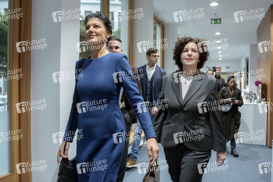 Sahra Wagenknecht und Amira Mohamed Ali bei der Pressekonferenz des BSW zur personellen Aufstellung des Parteipräsidiums im Haus der Bundespressekonferenz. Berlin, 10.11.2025
