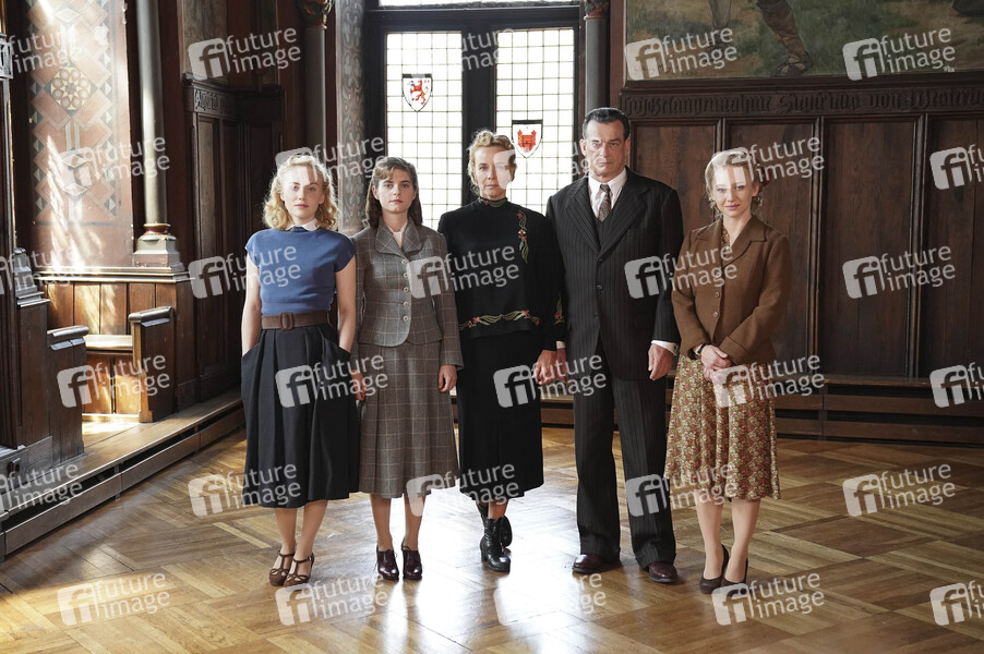 Elisa Schlott, Vanessa Loibl, Katja Riemann, Thomas Sarbacher und Anna Maria Mühe beim Fototermin am Set des ARD-Films 'Unsere wunderbaren Jahre' im Schloss Burg Solingen. Solingen, 03.07.2019