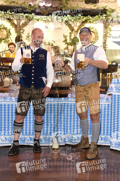 Björn Schwarz und Axel Schulz beim Fassanstich bei der 9. Hofbräu Berlin Wiesn im Hofbräu Wirtshaus Berlin. Berlin, 19.09.2020