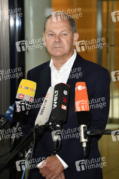 Olaf Scholz beim Pressestatement zu den Ereignissen im Rahmen der Großdemonstration in Berlin gegen die bestehenden Maßnahmen zur Eindämmung der Corona-Pandemie in der Passage vor dem Willy-Brandt-Haus. Berlin, 30.08.2020