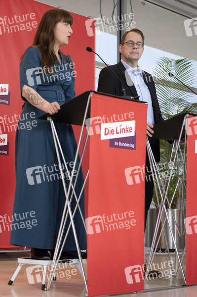 Politik, Statement, Pressekonferenz, PK, Reichstag, Deutscher Bundestag, Demokratie, Parlament, Parlamentsgebäude, Fraktion, Volksvertreter, MdB, Mitglied des Bundestages, Abgeordnete, Politikerin, Vorsitzende der Fraktion Die Linke, Politiker, Vorsitzender der Fraktion Die Linke