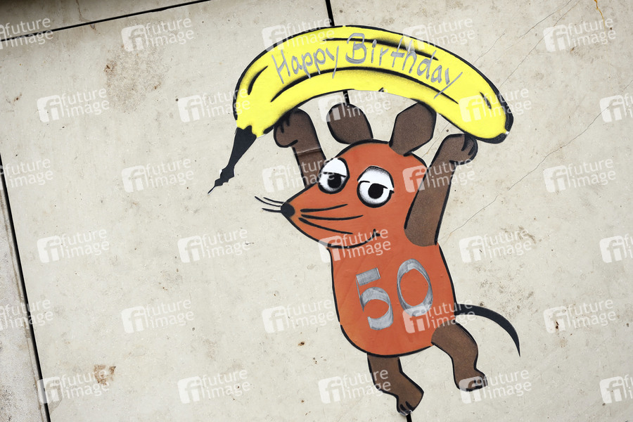 Anlässlich des 50. Geburtstag der Kindersendung 'Die Sendung mit der Maus' ist das Abbild der Maus an das WDR-Funkhaus gemalt worden. (Themenbild, Symbolbild) Köln, 15.10.2021