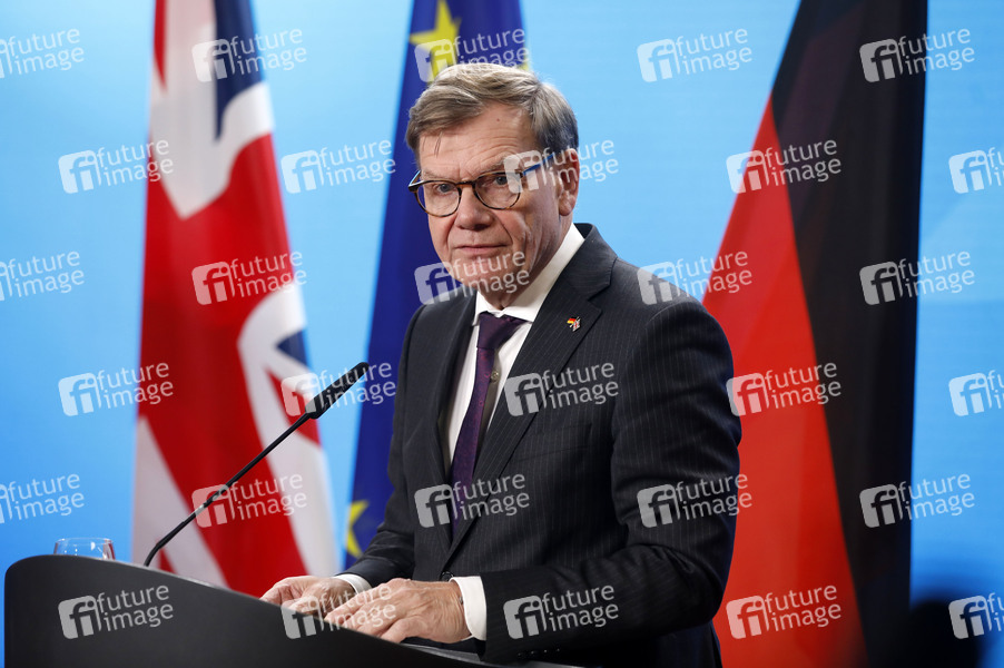 Johann Wadephul bei einer Pressekonferenz zu den Gesprächen mit Yvette Cooper zur bilateralen Zusammenarbeit nach dem Brexit, zur Unterstützung für die Ukraine und der Sicherheits- und Verteidigungspolitik im Auswärtigen Amt. Berlin, 19.11.2025