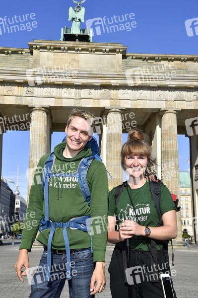 Meik Gudermann und Laura Kuhlen beim Fototermin zur Aktion '750 Kulturkilometer' von Köln nach Berlin am Brandenburger Tor um die Menschen während der Corona-Krise für die aktuelle Problemlage der Kulturlandschaft zu sensibilisieren. Berlin, 23.06.2020
