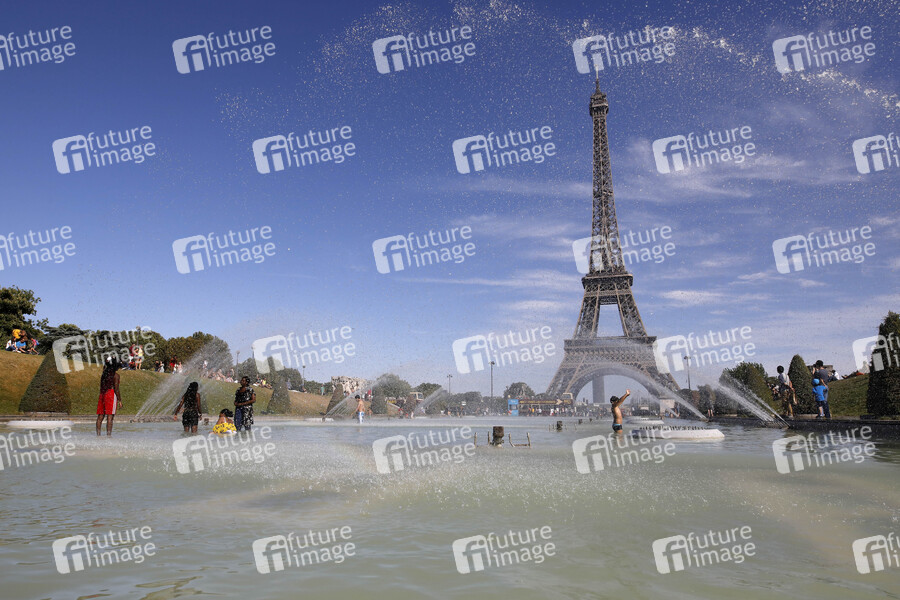 Tourismus, Touristen, Sightseeing, Stadt der Liebe, Wahrzeichen, Eiffelturm, Architektur, Sommer in Paris, Reiseziel, Frankreich, Kultur, Esplanade du Trocadero, Fontaine du Jardin du Trocadéro