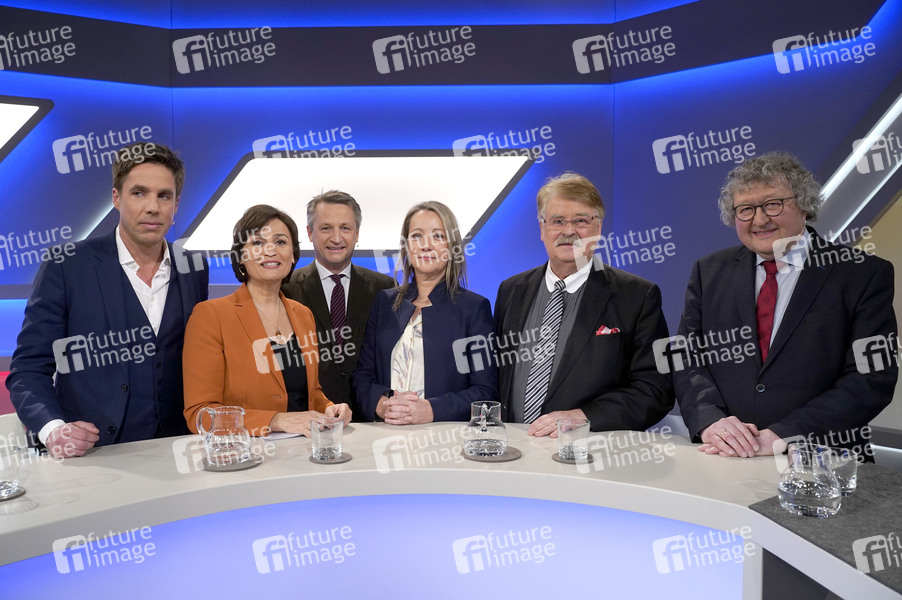 Markus Feldenkirchen, Sandra Maischberger, Nikolaus Blome, Cerstin Gammelin, Elmar Brok und Werner J. Patzelt in der ARD-Talkshow 'maischberger. die woche' im Studio Adlershof. Berlin, 12.02.2020