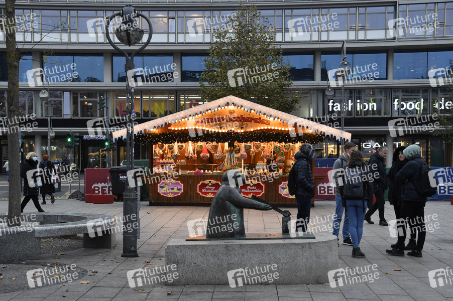 Als Alternative zu abgesagten Weihnachtsmärkten gibt es in diesem Jahr einzelne Stände mit Weihnachtsschmuck und Angeboten wie Glühwein, Mandeln und Bratwurst, hier in der City West am Breitscheidplatz. Berlin, 10.12.2020