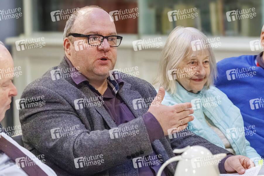 Jan Michaelis bei einer Lesung aus dem Buch 'Wie Väterchen Frost dem Osterhasen begegnete' von Leo Litz im Heinrich-Heine-Institut. Düsseldorf, 20.12.2025