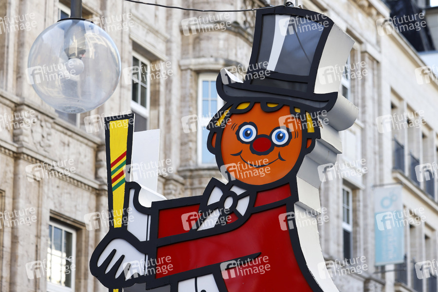 Auf der Kölner Schildergasse stehen beleuchtete Karnevalsfiguren der einzelnen Karnevalsgesellschaften. Sie markieren den Weg des Rosenmontagszugs, den es auch 2022 nicht geben wird, und sollen den Menschen in Corona-Zeiten ein Gefühl von Fastelovend vermitteln. (Themenbild, Symbolbild) Köln, 28.02.2022