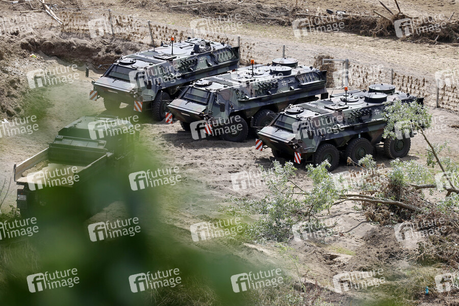 Nach dem Jahrhunderthochwasser in der Eifel durch heftige Regenfälle und Dauerregen mit Überschwemmungen und Überflutungen haben die Aufräumarbeiten im Ahrtal große Fortschritte gemacht. Einheiten von Polizei, THW, Bundeswehr und Feuerwehr mitsamt vielen freiwilligen Helfern haben Straßen geräumt, Schutt und Schlamm entfernt und die Menschen versorgt. Der Wiederaufbau wird trotzdem Jahre dauern. Im Bild Panzer der Bundeswehr in der Ortschaft Rech, in der die Flut viele Häuser zerstörte, 30.07.2021