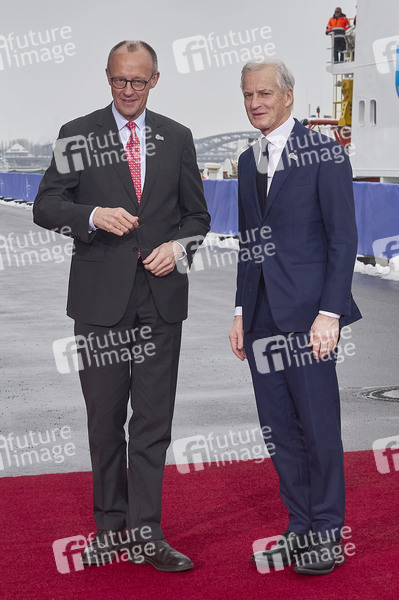 Friedrich Merz und Jonas Gahr Store beim Treffen der Regierungschefs zum 3. internationalen Nordsee-Gipfel 2026 im Cruise Ship Center Baakenhöft und einem Besuch auf dem Mehrzweckschiff 'Neuwerk'. Ziel des Gipfels ist es, den grenzüberschreitenden Ausbau der Offshore-Windenergie, den Wasserstoffmarkt und zugleich eine leistungsfähige und vernetzte Offshore-Infrastruktur im gesamten Nordseeraum weiter voranzutreiben. Hamburg, 26.01.2026