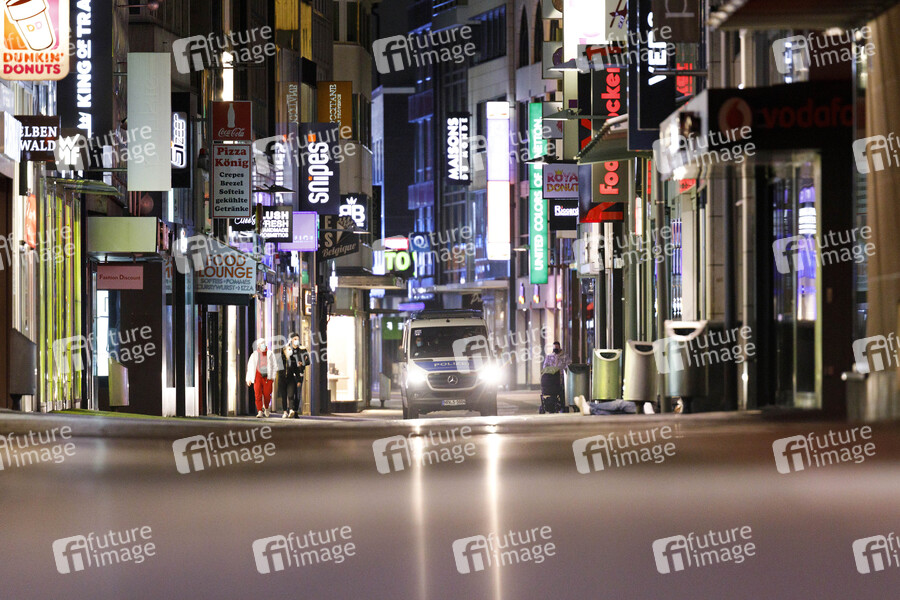 In Köln gelten seit dem 17.04.2021 um 0 Uhr Ausgangsbeschränkungen. Das Verlassen der Wohnung ist dann in der Zeit von 21 Uhr bis 5 Uhr fast ausnahmslos verboten. Die Beschränkungen beschloss der Krisenstab der Stadt Köln am Freitag. Ordnungsamt und Polizei kontrollieren die nächtlichen Straßen wie die Einkaufsstraße Hohe Straße im Bild. (Themenbild, Symbolbild) Köln, 17.04.2021