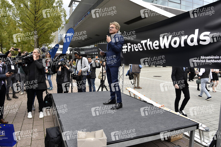 Hauptgeschäftsführer des Börsenvereins, Protest, Demonstration, Regenschirme für die Meinungsfreiheit, Messe, Book Fair, Leitmesse, Buch, Literatur, Kultur, Börsenverein des Deutschen Buchhandels mit Amnesty International Deutschland, European and International Booksellers Federation, International Publishers Association, PEN International, PEN-Zentrum Deutschland, Reporter ohne Grenzen, Protestaktion, Regenschirm-Protest auf der Frankfurter Buchmesse