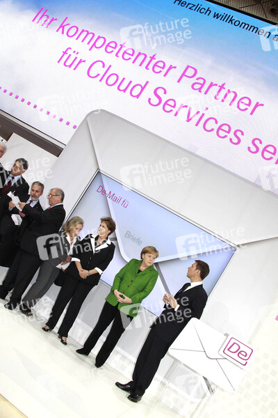 Eröffnungsrundgang von Bundeskanzlerin Merkel auf der CeBIT 2012 (Centrum der Büro- und Informationstechnik), der weltgrößten Messe für Informations- und Computertechnik auf dem Messegelände, Hannover - Am Messestand der Deutschen Telekom