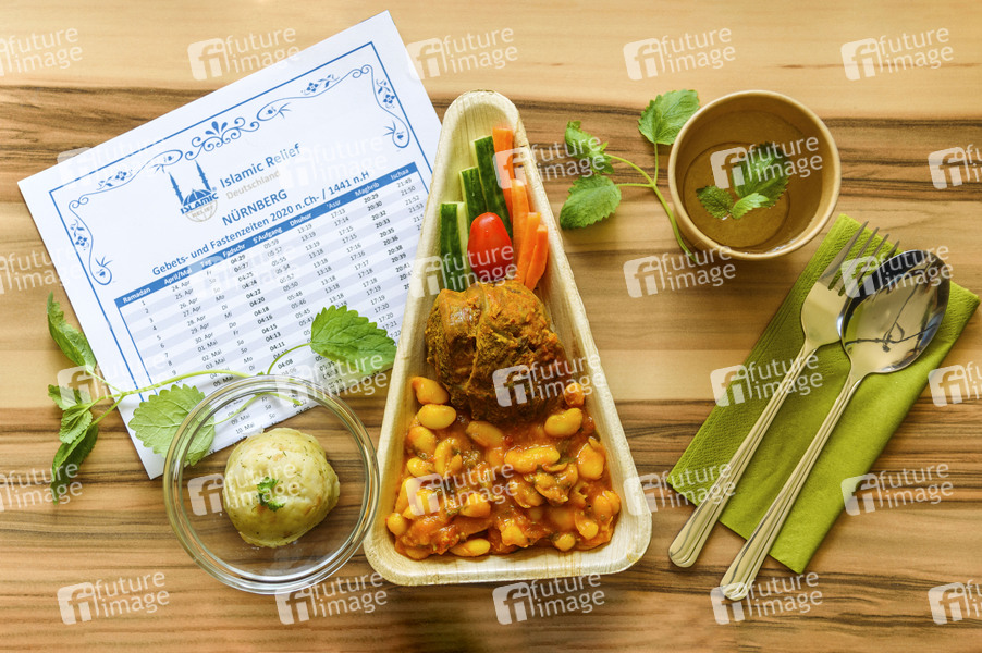 Ein Gericht mit Islamic Relief Fastenkalender 'Selbstdarstellung Gebets- und Fastenzeiten 2020 n.Chr. / 1441 n.H.' im Fastenmonat Ramadan