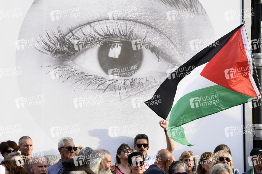 Anti-Israel-Demo, Demonstration, Protest, Filmpremiere, Premiere, Kino, Film, Eröffnung, Opening Ceremony, Eröffnungsgala, Roter Teppich, Ankunft, Unterhaltung, Entertainment, Kultur, Filmfest, Internationales Filmfestival, SSIFF, 73rd San Sebastian International Film Festival, Donostia Zinemaldia - Festival de San Sebastián