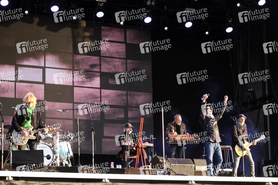 Christof Stein-Schneider, Gero Drnek, Martin Huch, Kai Wingenfelder und Thorsten Wingenfelder von Fury in the Slaughterhouse live beim Autokultur-Konzert auf dem Schützenplatz. Die Besucher verfolgen unter Berücksichtigung klarer Hygiene-Vorschriften während der Corona-Krise den Auftritt aus dem Auto. Hannover, 14.05.2020